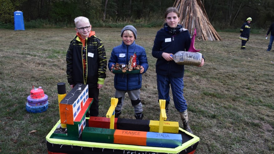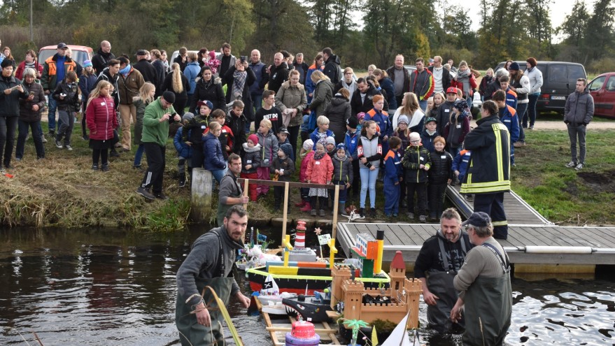 Aus Gips, Wasser und Farbe hatte Florian Wilfried (6) sich einen Dinosaurier gebastelt und auf das Holzgestell gesetzt, das Vater Christian Jantzen gebaut hatte. Mutter Claudia Jantzen komplettierte den Bootsbau mit Tannengrün und Blumen. Dann hieß es Daumendrücken, auch von Florians Schwester Sarah für das „Dino-Boot“.